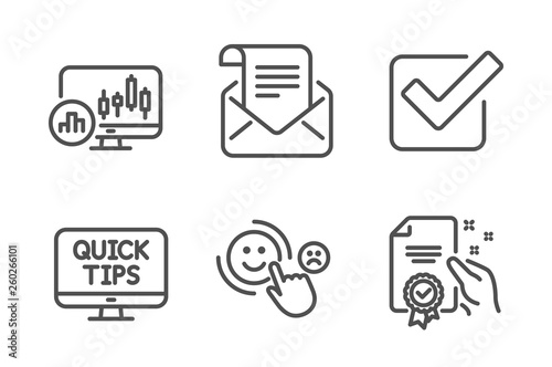 Mail newsletter, Web tutorials and Customer satisfaction icons simple set. Candlestick chart, Checkbox and Certificate signs. Open e-mail, Quick tips. Education set. Line mail newsletter icon. Vector