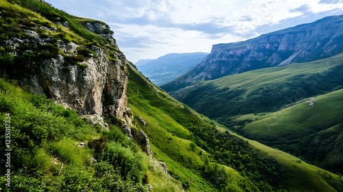 Majestic Mountain Valley with Lush Green Hills under Expansive Cloudy Sky : Generative AI
