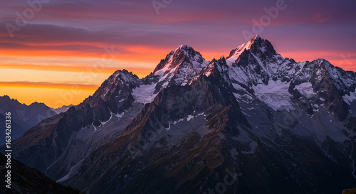 Majestic Snow-Capped Mountains at Sunset with Vibrant Sky Colors
