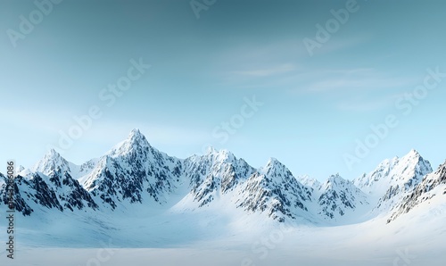 Majestic snow-covered mountain peaks rise against soft turquoise sky creating serene winter landscape panorama. Pristine alpine scenery with dramatic ridgelines and valleys.