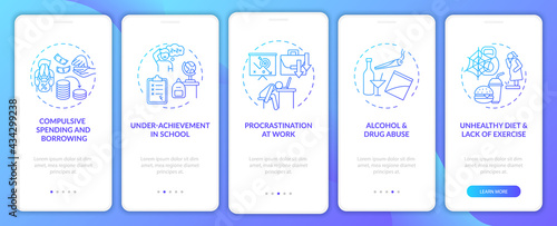 Major self-control problems navy onboarding mobile app page screen with concepts. Burnout walkthrough 5 steps graphic instructions. UI, UX, GUI vector template with linear color illustrations