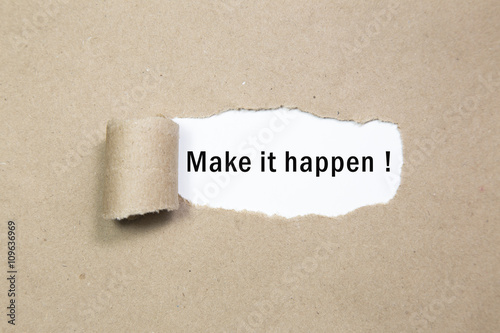 Make it happen! appearing behind torn brown paper.