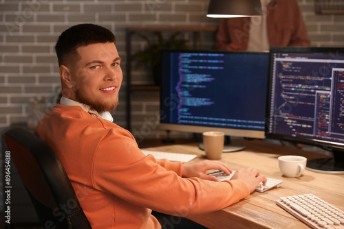 Male programmer working with computer in office at night