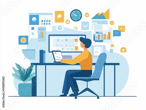 Man analyzing data on laptop, office desk, charts background, project management