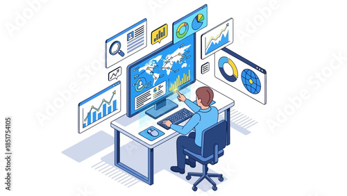 Man Analyzing Data on Multiple Computer Screens.
