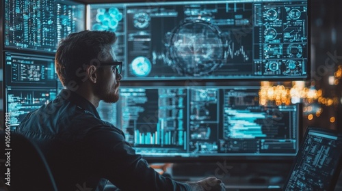 Man analyzing data on multiple futuristic digital screens