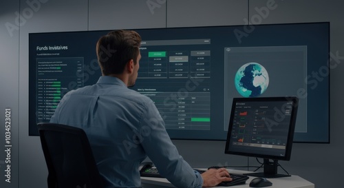 Man analyzing data on multiple screens in office setting