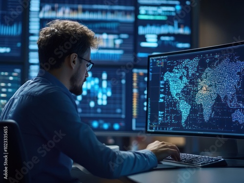 Man analyzing data trends with world map, night mode
