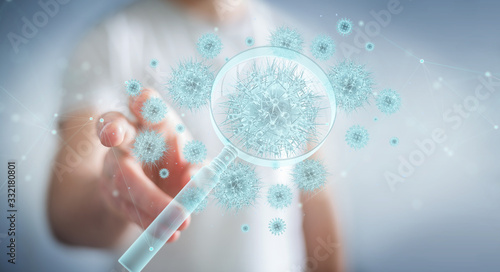 Man analyzing holographic coronavirus projection through magnifying glass 3D rendering