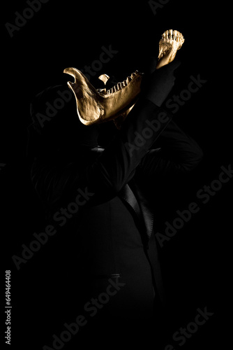 Man dressed in black suit holding gold objects on black background