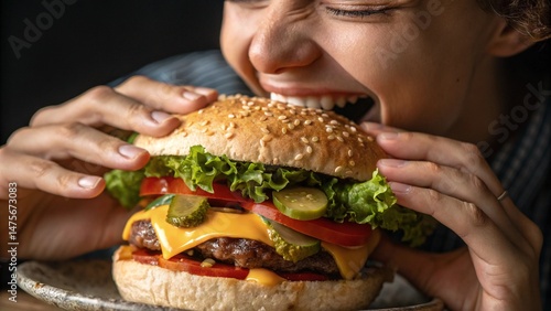 man eating hamburger