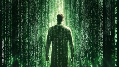 Man facing digital code wall. Possible stock photo use