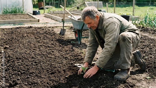 Man Gardening in Backyard Using Gardening Tools.