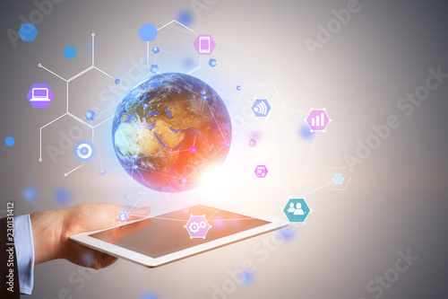 Man hand with tablet, hi tech earth