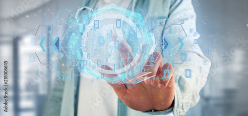 Man holding a Technology question mark icon on a circle 3d rendering