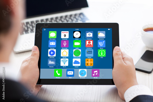 man holding tablet with home screen icons apps over table