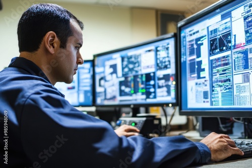 Man in blue workwear using computer with multiple screens