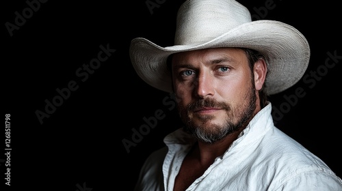Man in cowboy hat, portrait against black background. Possible use stock photo for western, fashion, or historical themes