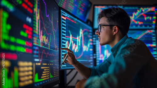 Man in glasses viewing computer with multiple screens