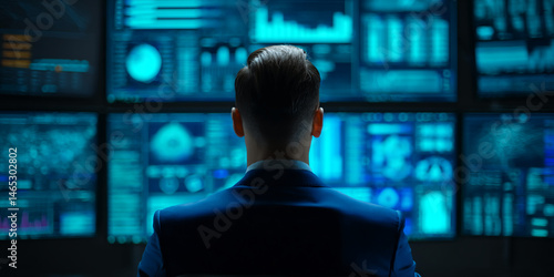 Man in suit viewing multiple screens displaying data graphs, representing data analysis, technology, and business intelligence
