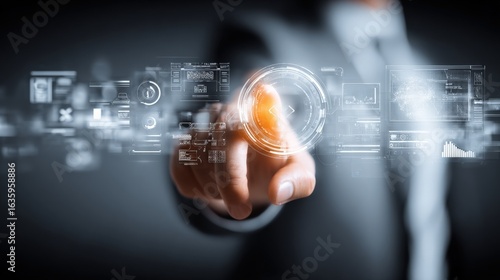 Man Interacting with Futuristic Interface: Business Technology Concept with Virtual Reality and Data Visualization
