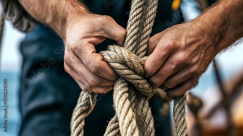 Man is tying a rope. The rope is brown and the man is wearing a blue shirt