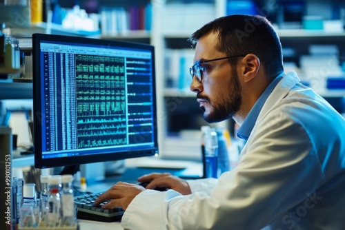 Man laboratory setting sitting desk working computer monitor