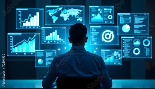 Man looking at multiple screens displaying charts, graphs, and world map, representing data analysis and technology