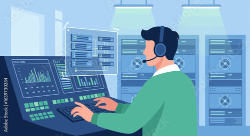 Man managing servers in data center with real-time data visualization