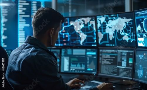 Man monitors multiple computer screens displaying cyber security data advanced persistent threat