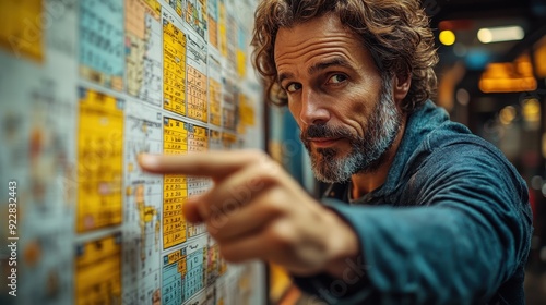 Man Pointing at a Wall of Handwritten Notes in a City.
