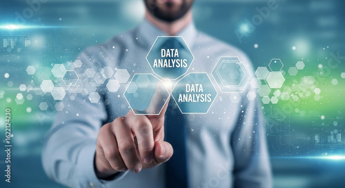 Man pointing at data analysis hexagons on a digital interface with a blurred background effect scene