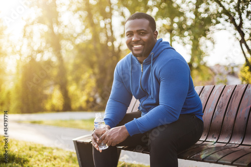 man, african american, exercise, resting, water, drinking, bench, sitting, physical exercise, refreshment, training, reduce, lose weight, fat, overweight, recreation, sleepy, relaxation, enjoyment, thirsty, smiling, happy, black, african, ethnicity, fitness, exhaustion, sunny, health, healthy, practicing, vitality, active, urban, park, sunlight, city, nature, muscular, spring, holding, bottle, male, athlete, adult, one person