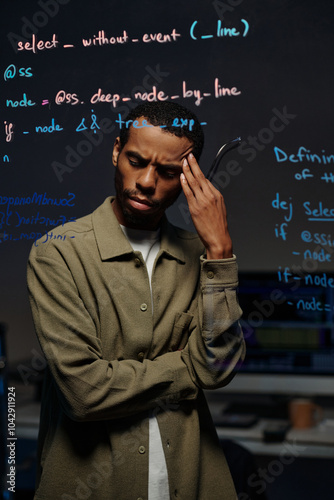 Man reviewing coding script on digital screen in professional workspace while holding head in focus. Expression of concentration and depth in thinking