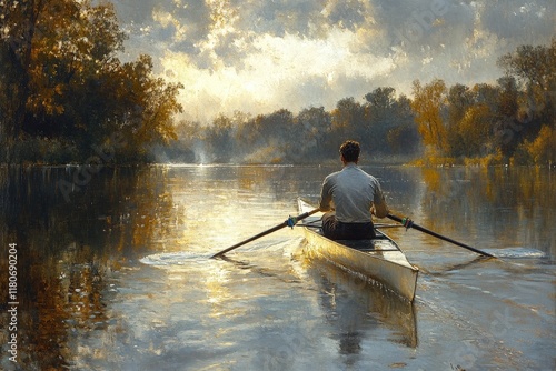 Man rows scull on tranquil river, sunset.