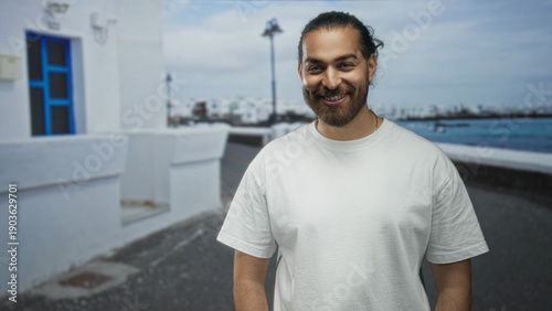 Man smiling showing braces and beard on a seaside street promenade near the harbor in daylight wearing a white tshirt; carefree happiness.