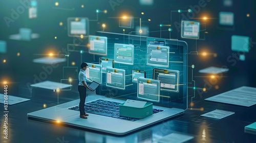 Man standing laptop papers