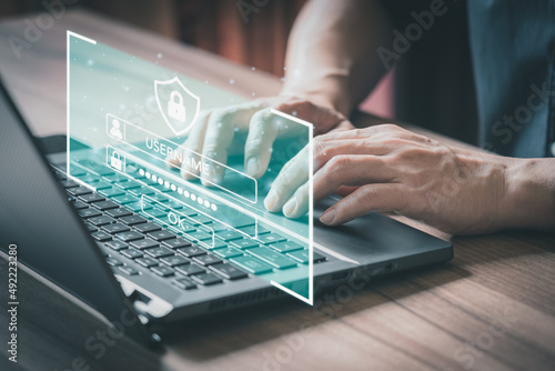 Man typing login and password, cyber security concept, Secure encryption and access to the user's private information to access the Internet.