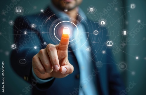 Man uses thumb to scan fingerprint for digital processing, biometric identification, accesses security system. Includes internet banking, cloud system, mobile phone with cyber security interface,
