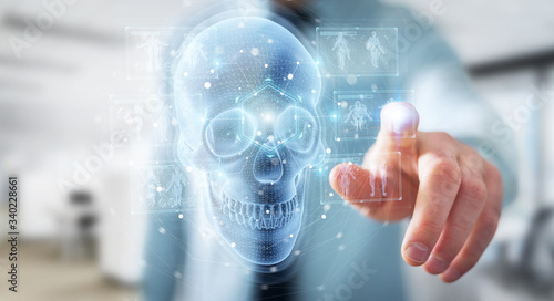 Man using digital x-ray skull holographic scan projection 3D rendering