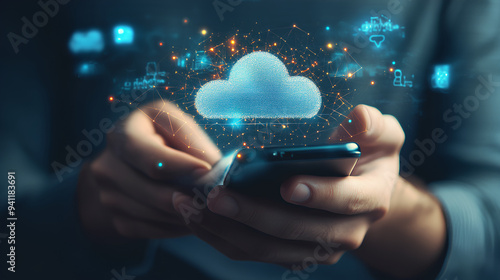 Man using smart phone showing cloud computing diagram in hand cloud technology data storage network and internet services concept