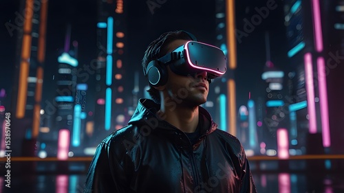 Man using vr headset in futuristic city metaverse experience virtual reality simulation