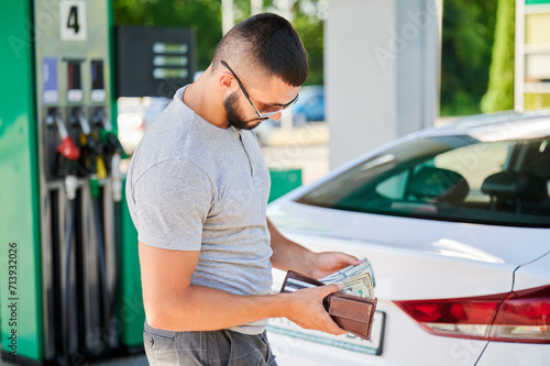 Man waiting for petrol station operator to pay for fuel. Handsome man near his car counting how much gasoline costs. Male in casual clothes holding money.