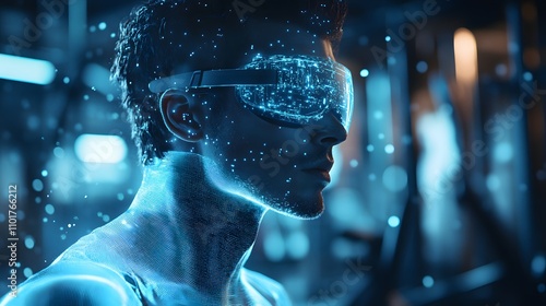 Man wearing VR headset, futuristic digital interface.