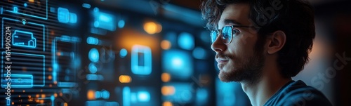 Man with glasses looking at a computer screen banner copy space