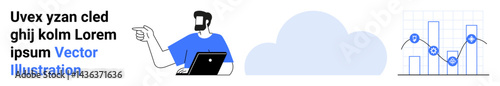 Man with laptop pointing toward a screen with data visualization graphs and cloud icon. Ideal for analytics, technology, cloud services, business insights, teamwork, remote work, flat landing page