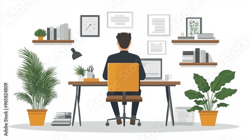 Man Working at Home Office Desk with Plants and Shelves Illustrations