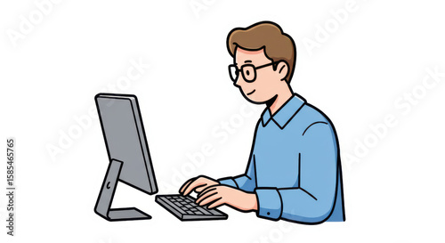 Man Working on Computer - Simple Flat Vector Illustration