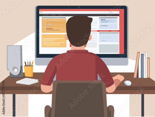 Man working on desktop computer with coding and web design interface at modern office workspace flat vector illustration