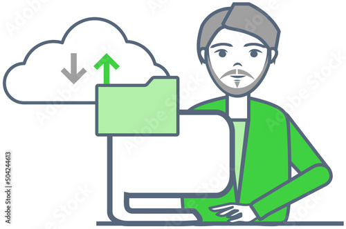 Man works with virtual cloud storage. Program for saving information and personal data protection. Virtualized storage system for computer. Male character stores online data in digital cloud website